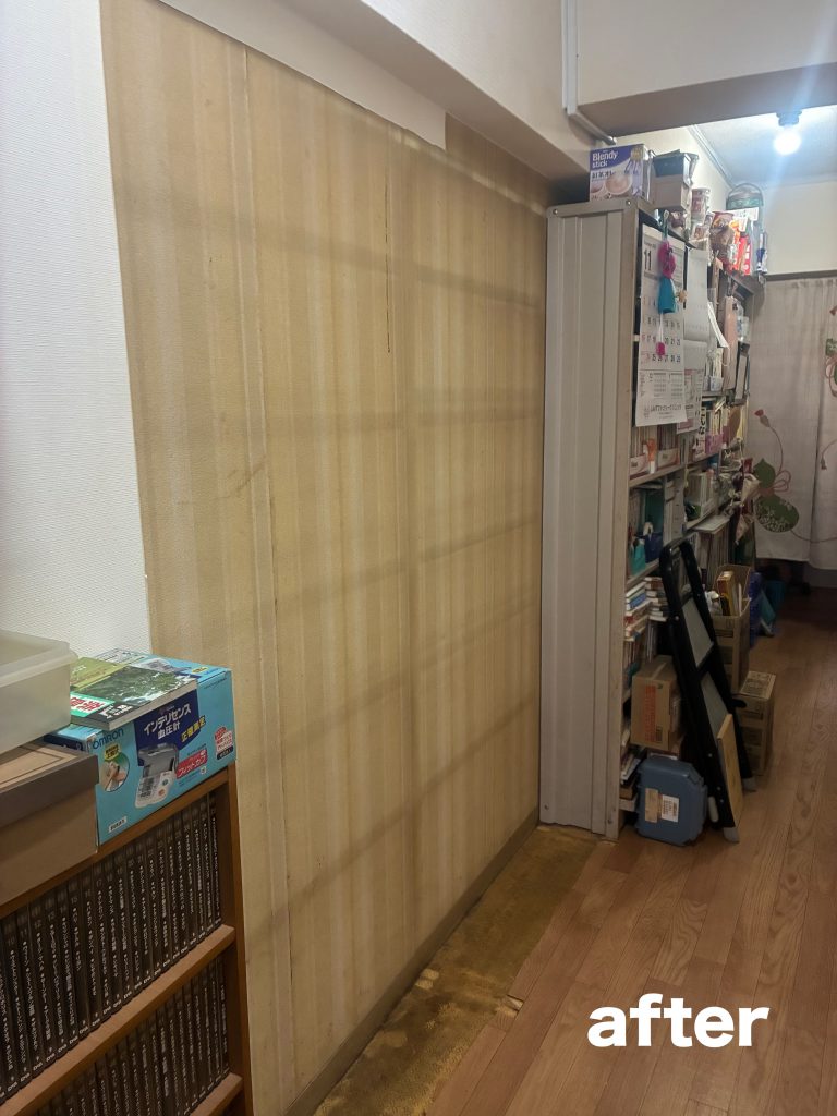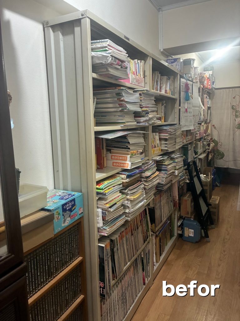 お家に旦那様のベットを搬入するため、入り口の沢山の本と本棚を処分したいとのご希望です。
